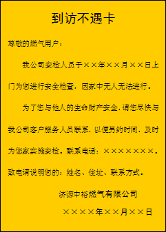 該貼原文為:“下班回家,見門上有一張與其他彩頁廣告不一樣的紙牌,看后方知是濟源中裕燃氣公司的安檢人員特意留下的到訪不遇卡??ǖ拇笾聝热菔亲鹁吹奶烊粴庥脩?,我公司安檢人員于某時間到您家中進行安全檢查,因家中無人無法進行。為了您和他人的生命財產安全,請您盡快與我公司客戶中心聯系,以便另約時間。聯系電話……小小一片卡,反映出一個行業的工作作風,小小一片卡,大大拉近了供求之間的距離,小小一片卡,異常暖人心?!?